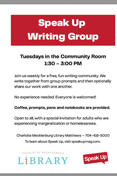 Details about the Matthews Writing Community. Here’s the library event listing.